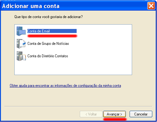 04 – Selecione o tipo de conta chamada “Conta de Email” e clique no botão “Avançar”