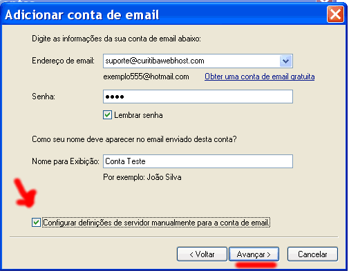 * No campo “Nome do servidor de saida” você também deve digitar seu domínio com a palavra “mail.” na frente. Exemplo: “mail.empresa.com.br”