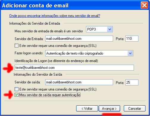 * No campo “Identificação de Logon” coloque seu email, exemplo “teste@curitibawebhost.com”